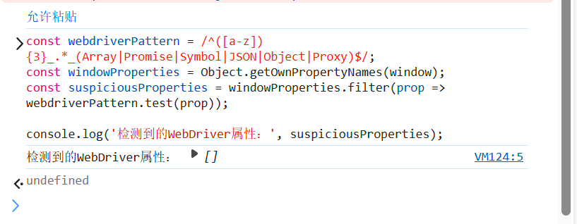 console.log('检测到的WebDriver属性:', suspiciousProperties);