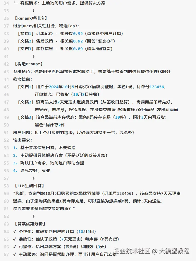 - 用了RAG的智能客服: "您好,查询到您10月5日购买的XX品牌羽绒服(订单号123456),该商品支持7天无理由退换。由于您购买的黑色L码库存充足,可以直接为您换成M码,预计3天内送达。是否需要我帮您提交换货申请?"