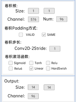 本bottleneck结构第三层Conv2D卷积核的宽、高、通道、个数是(1 x 1 x 576 x 96),padding方式为SAME,步长为1,经过计算可知,输出特征矩阵为(14 x 14 x 96)。