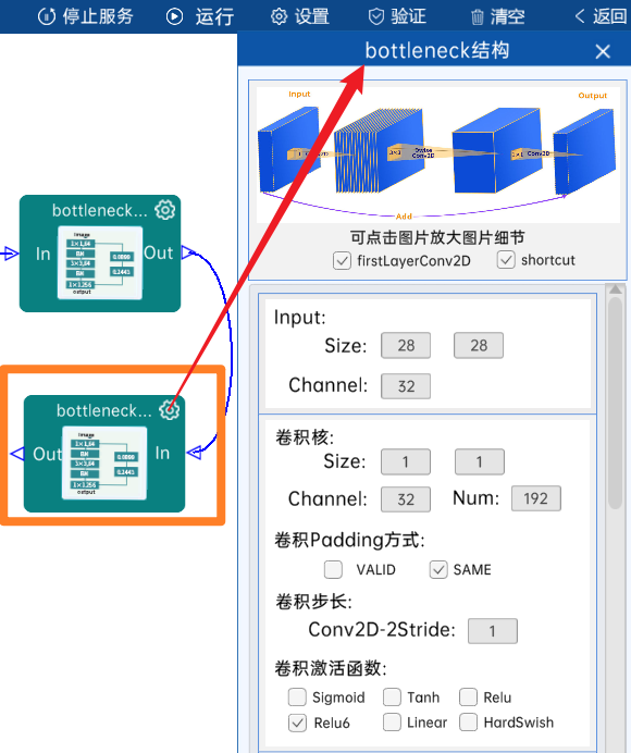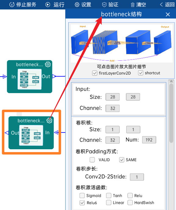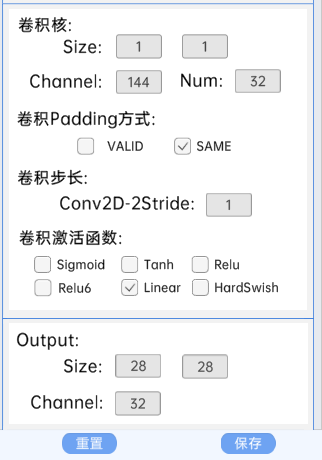 本bottleneck结构第三层Conv2D卷积核的宽、高、通道、个数是(1 x 1 x 144 x 32),padding方式为SAME,步长为1,经过计算可知,输出特征矩阵为(28 x 28 x 32)。