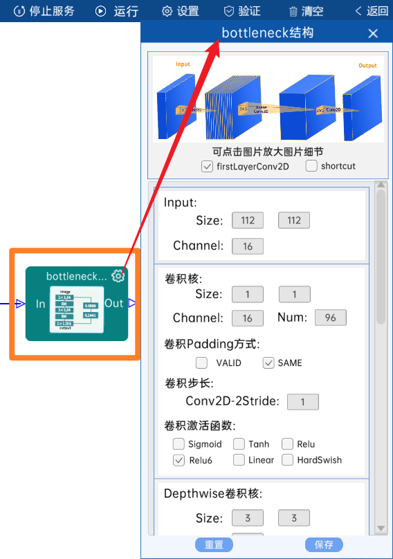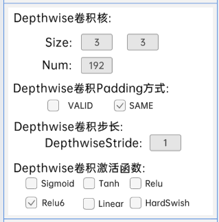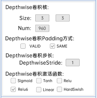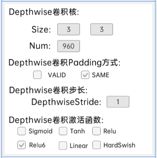 本bottleneck结构第一层Conv2D卷积核的宽、高、通道、个数是(1 x 1 x 16 x 96),padding方式为SAME,步长为1,经过Relu6激活函数,经过计算可知,输出特征矩阵为(112 x 112 x 16)。