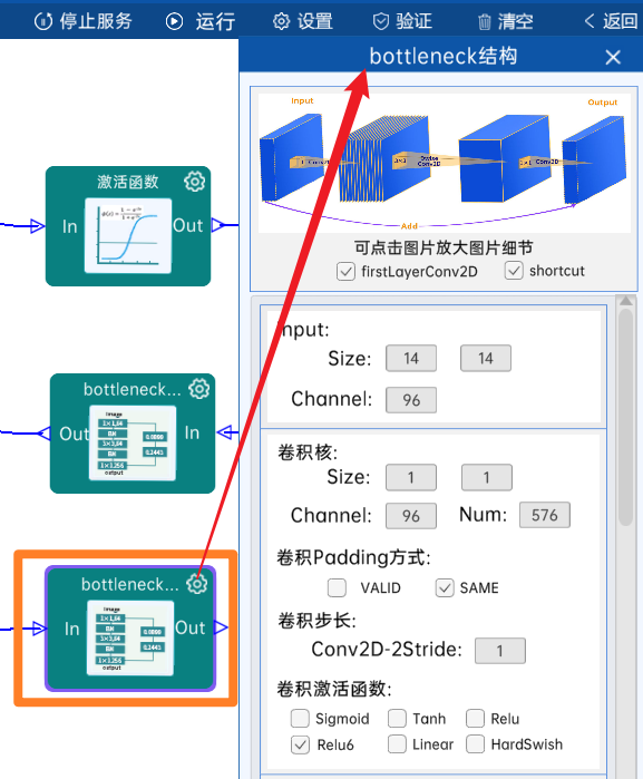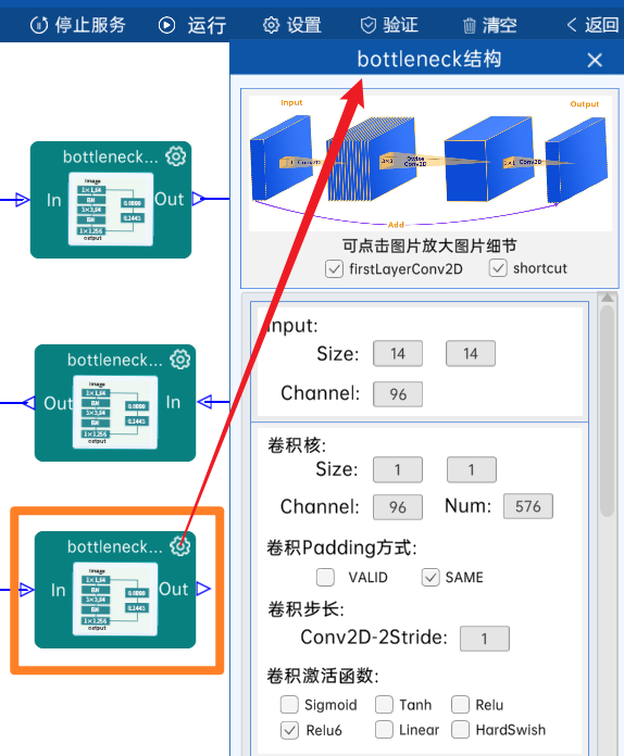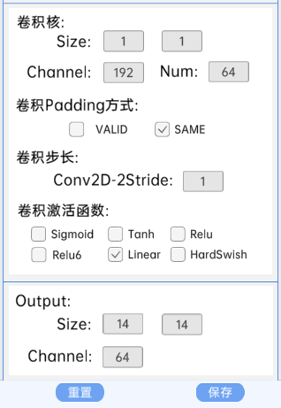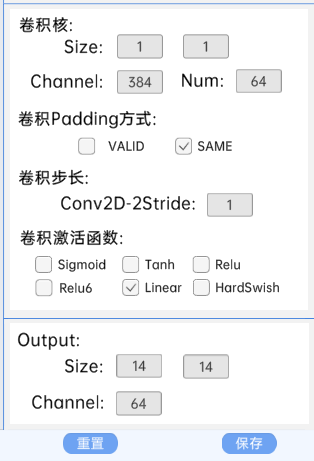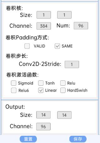 本bottleneck结构第三层Conv2D卷积核的宽、高、通道、个数是(1 x 1 x 384 x 96),padding方式为SAME,步长为1,经过计算可知,输出特征矩阵为(14 x 14 x 96)。