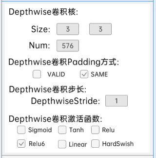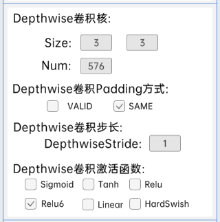 本bottleneck结构第二层DwiseConv2D卷积核的宽、高、个数是(3 x 3 x 576),padding方式为SAME,步长为1,经过batchNorm进行归一化,以及Relu6激活函数,经过计算可知,输出特征矩阵为(14 x 14 x 576)。
