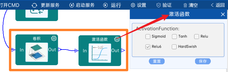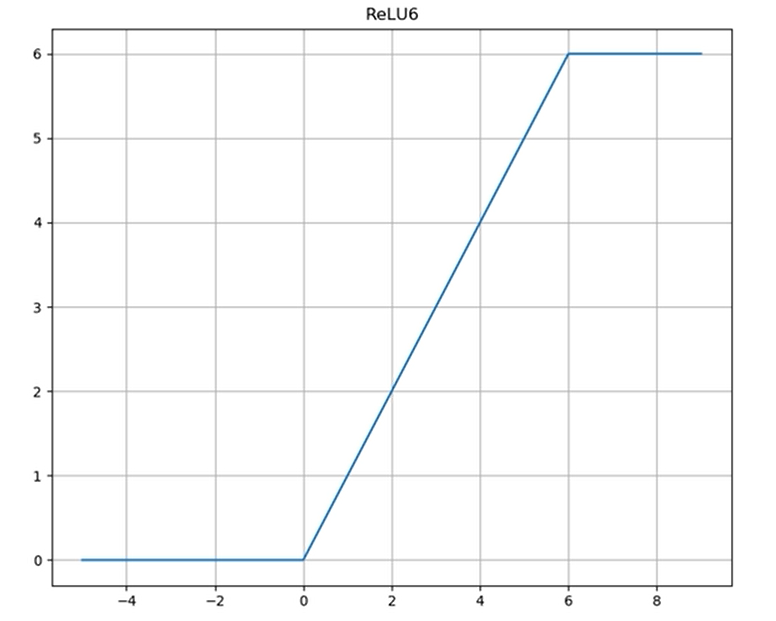 可以看到Relu6激活函数是Relu的变种,在输入小于0时,结果为0,输入大于6时:结果为6。在0到6之间时: