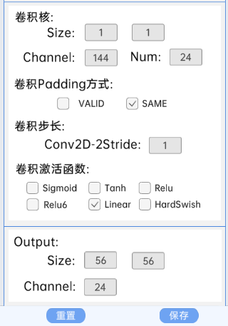 本bottleneck结构第三层Conv2D卷积核的宽、高、通道、个数是(1 x 1 x 144 x 24),padding方式为SAME,步长为1,经过计算可知,输出特征矩阵为(56 x 56 x 24)。