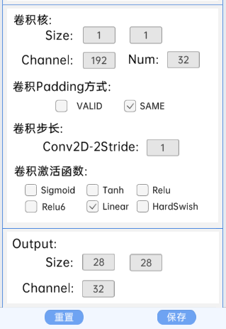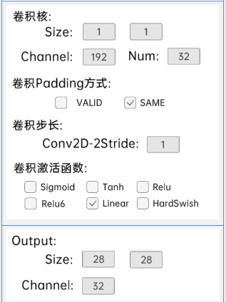 本bottleneck结构第三层Conv2D卷积核的宽、高、通道、个数是(1 x 1 x 192 x 32),padding方式为SAME,步长为1,经过计算可知,输出特征矩阵为(28 x 28 x 32)。