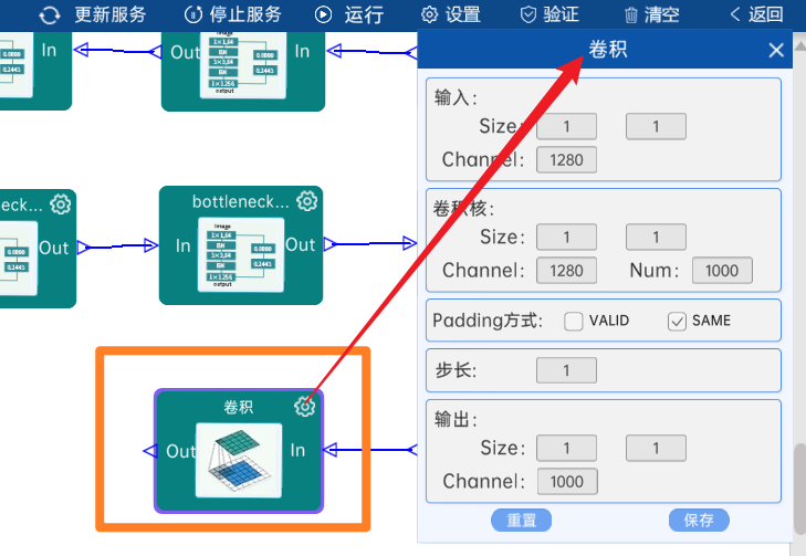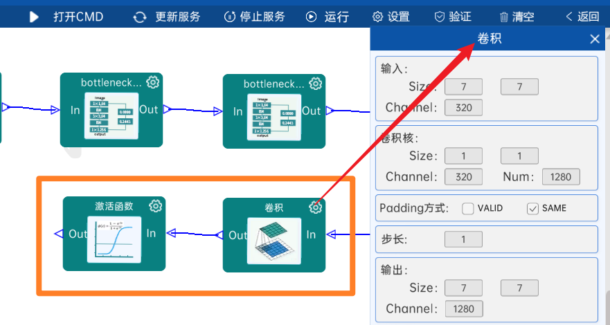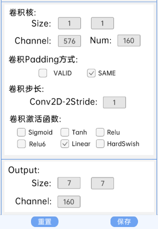 本bottleneck结构第三层Conv2D卷积核的宽、高、通道、个数是(1 x 1 x 576 x 160),padding方式为SAME,步长为1,经过计算可知,输出特征矩阵为(7 x 7 x 160)。