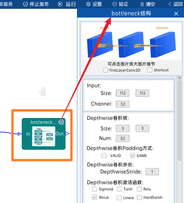 本bottleneck结构第一层DwiseConv2D卷积核的宽、高、个数是(3 x 3 x 32),padding方式为SAME,步长为1,经过batchNorm进行归一化,以及Relu6激活函数,经过计算可知,输出特征矩阵为(112 x 112 x 32)。