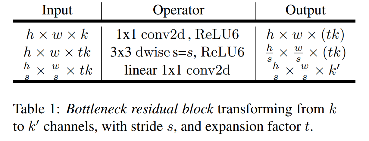 paper的Table 1给出了倒残差结构的特征矩阵,如下图所示: