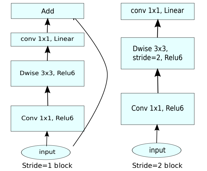 如下图所示,左侧为有shortcut连接的倒残差结构,右侧是无shortcut连接的倒残差结构: