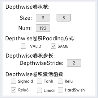 本bottleneck结构第二层DwiseConv2D卷积核的宽、高、个数是(3 x 3 x 192),padding方式为SAME,步长为2,经过batchNorm进行归一化,以及Relu6激活函数,经过计算可知,输出特征矩阵为(14 x 14 x 192)。