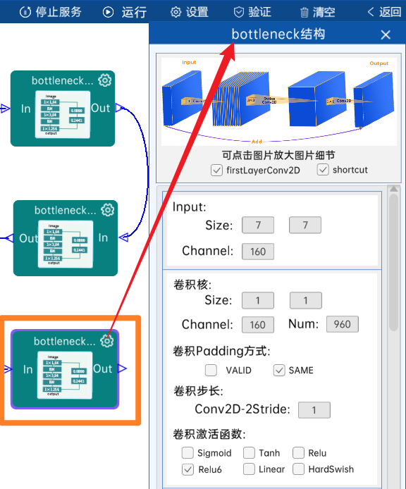 注意:在第一个bottleneck结构中,由于t=1,所以并没有进行升维操作,即没有第一个Conv2D层。