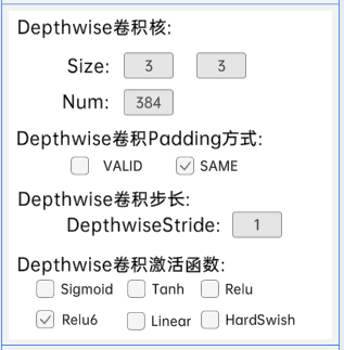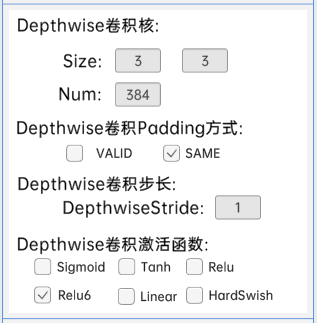 本bottleneck结构第二层DwiseConv2D卷积核的宽、高、个数是(3 x 3 x 384),padding方式为SAME,步长为1,经过batchNorm进行归一化,以及Relu6激活函数,经过计算可知,输出特征矩阵为(14 x 14 x 384)。