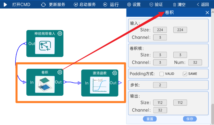 输入特征矩阵是(224 x 224 x 3),本层卷积核的宽、高、通道、个数是(3 x 3 x 3 x 32),步长为2,padding方式为SAME,经过计算可知,输出特征矩阵为(112 x 112 x 32)。