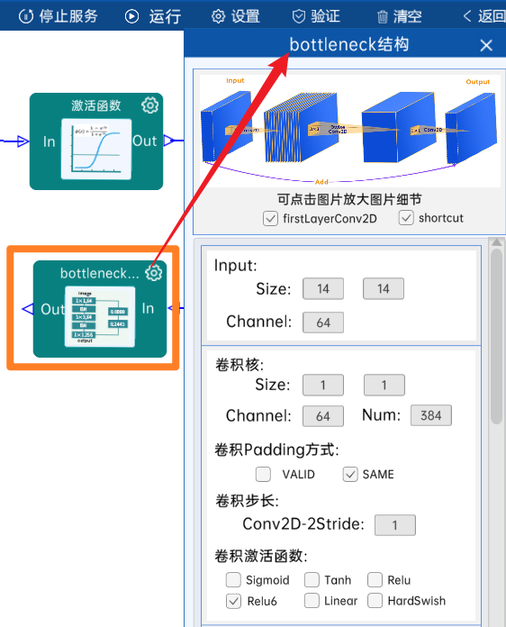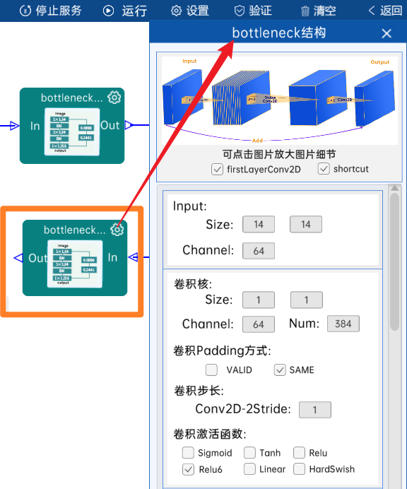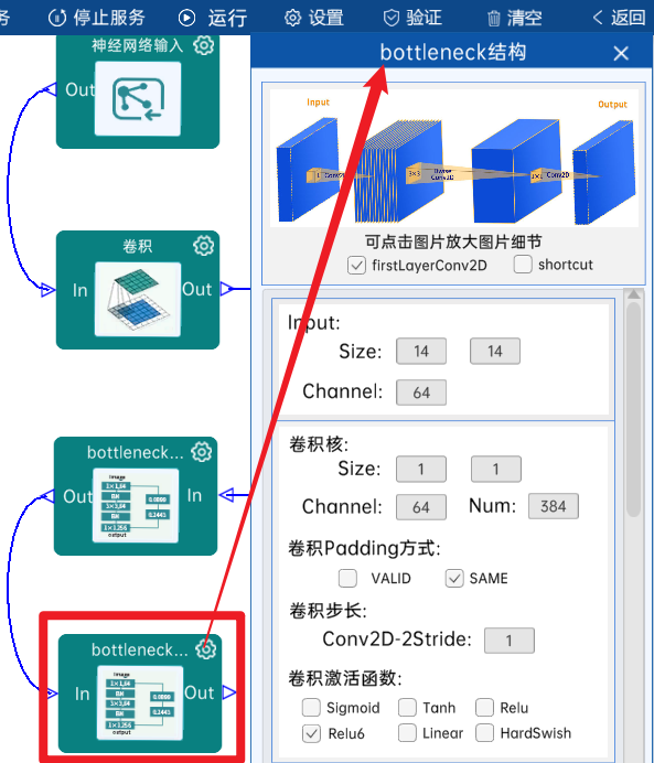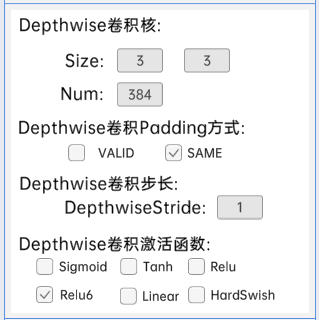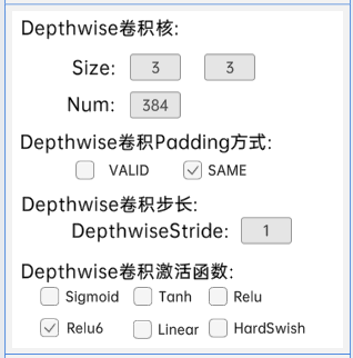 本bottleneck结构第一层Conv2D卷积核的宽、高、通道、个数是(1 x 1 x 64 x 384),padding方式为SAME,步长为1,经过Relu6激活函数,经过计算可知,输出特征矩阵为(14 x 14 x 384)。