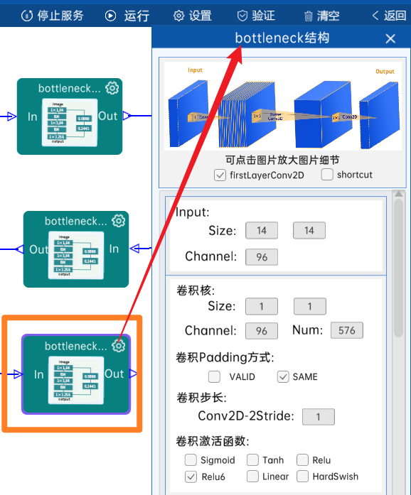本bottleneck结构第一层Conv2D卷积核的宽、高、通道、个数是(1 x 1 x 96 x 576),padding方式为SAME,步长为1,经过Relu6激活函数,经过计算可知,输出特征矩阵为(14 x 14 x 576)。
