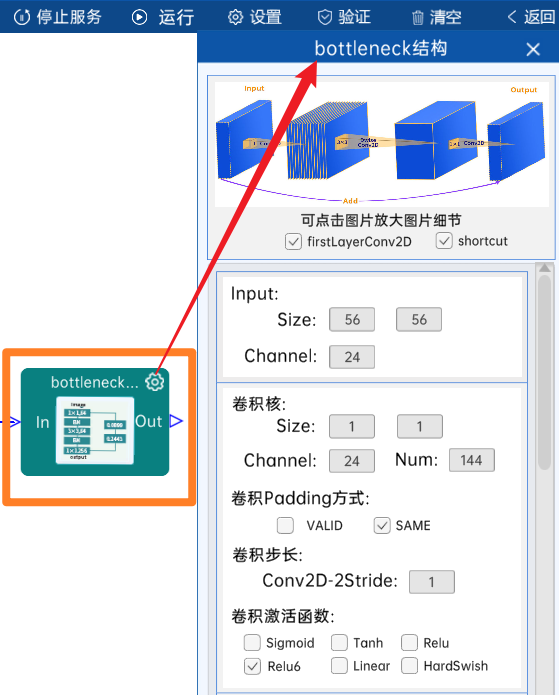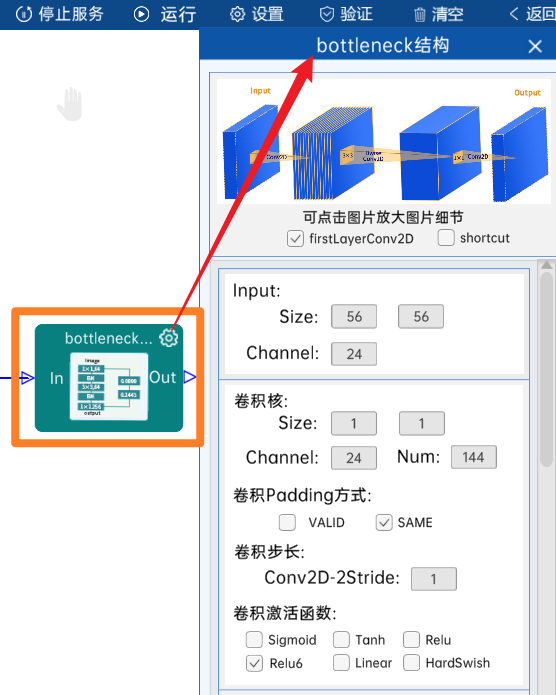 本bottleneck结构第一层Conv2D卷积核的宽、高、通道、个数是(1 x 1 x 24 x 144),padding方式为SAME,步长为1,经过Relu6激活函数,经过计算可知,输出特征矩阵为(56 x 56 x 144)。
