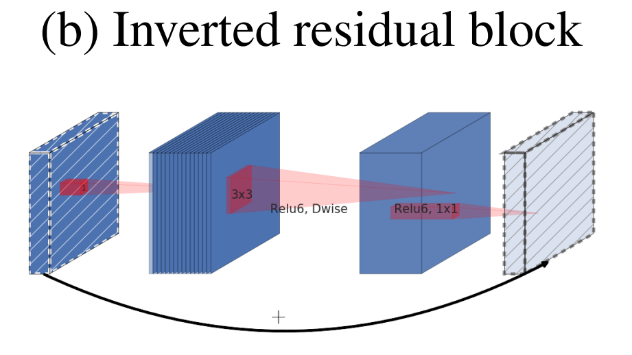 3最后一个卷积层是1x1卷积,起到降维作用,注意卷积后只跟了BN结构,并没有使用Relu6激活函数。倒残差结构的具体过程如下图所示: