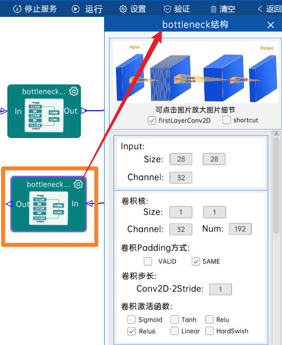 本bottleneck结构第一层Conv2D卷积核的宽、高、通道、个数是(1 x 1 x 32 x 192),padding方式为SAME,步长为1,经过Relu6激活函数,经过计算可知,输出特征矩阵为(28 x 28 x 192)。