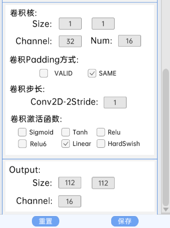本bottleneck结构第二层Conv2D卷积核的宽、高、通道、个数是(1 x 1 x 32 x 16),padding方式为SAME,步长为1,经过计算可知,输出特征矩阵为(112 x 112 x 16)。