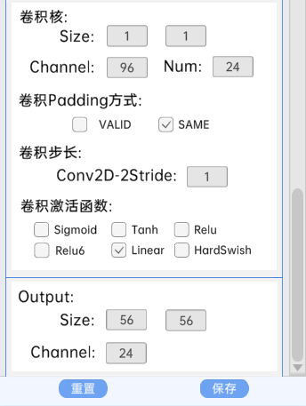 本bottleneck结构第三层Conv2D卷积核的宽、高、通道、个数是(1 x 1 x 96 x 24),padding方式为SAME,步长为1,经过计算可知,输出特征矩阵为(56 x 56 x 24)。
