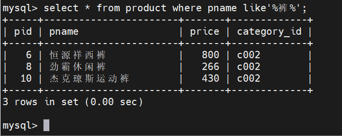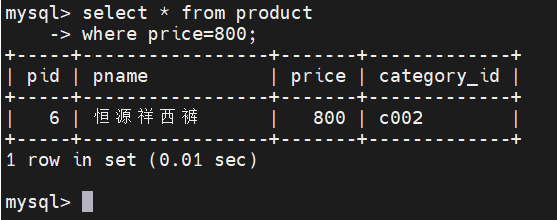 insert into product values(null,'恒源祥西裤',800,'c002');