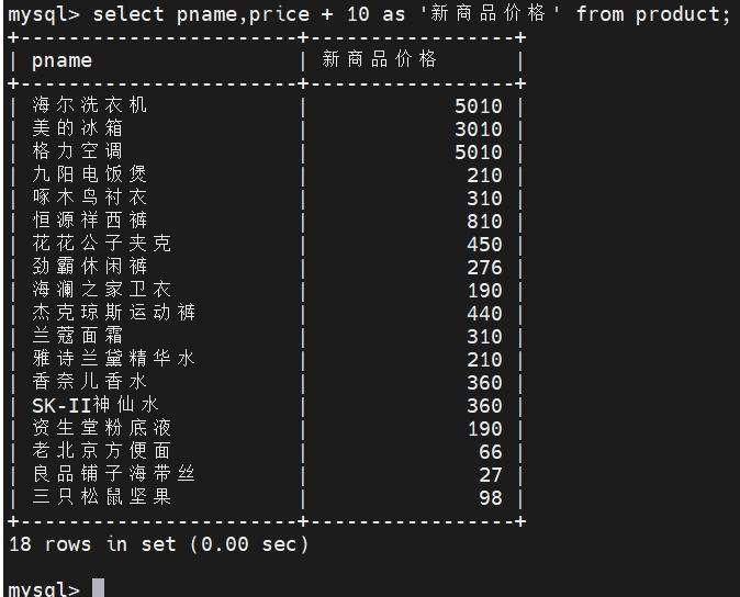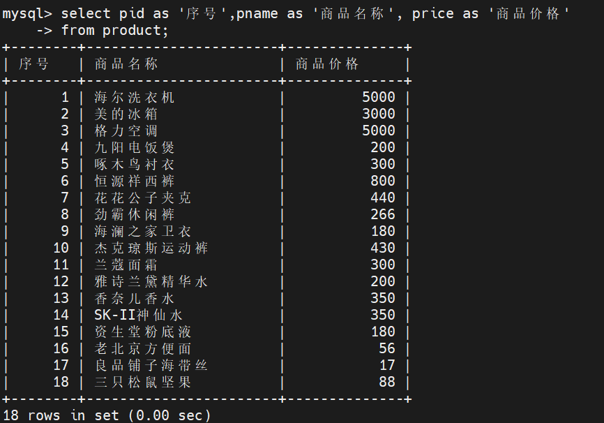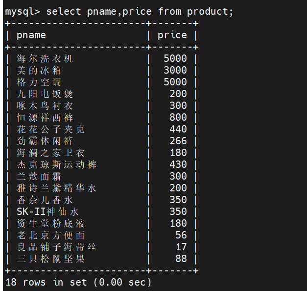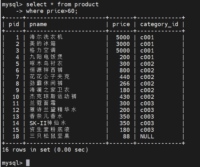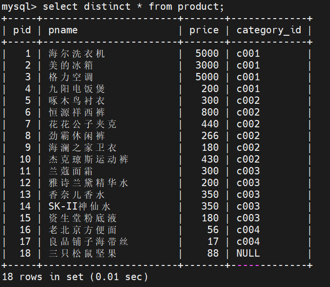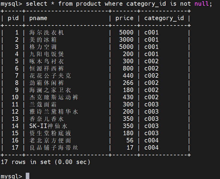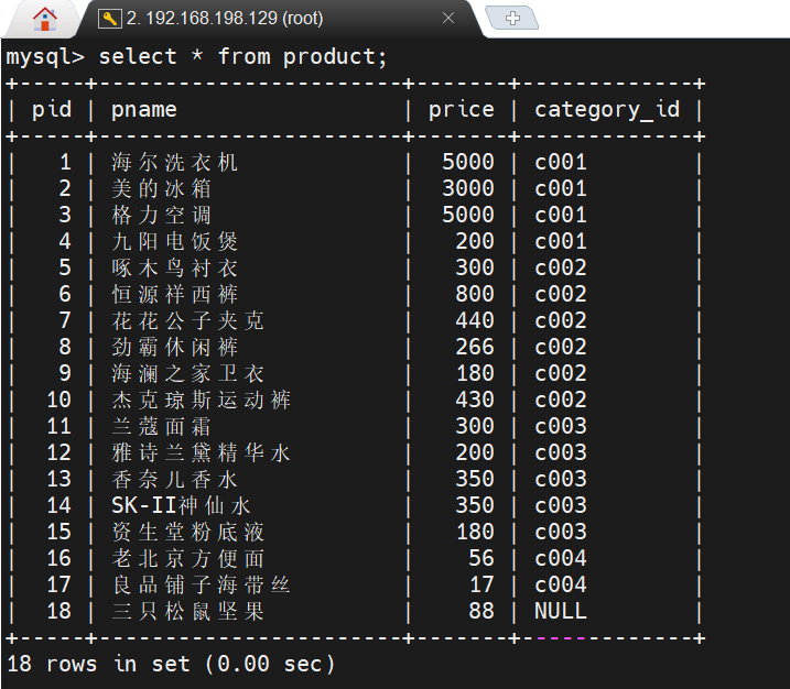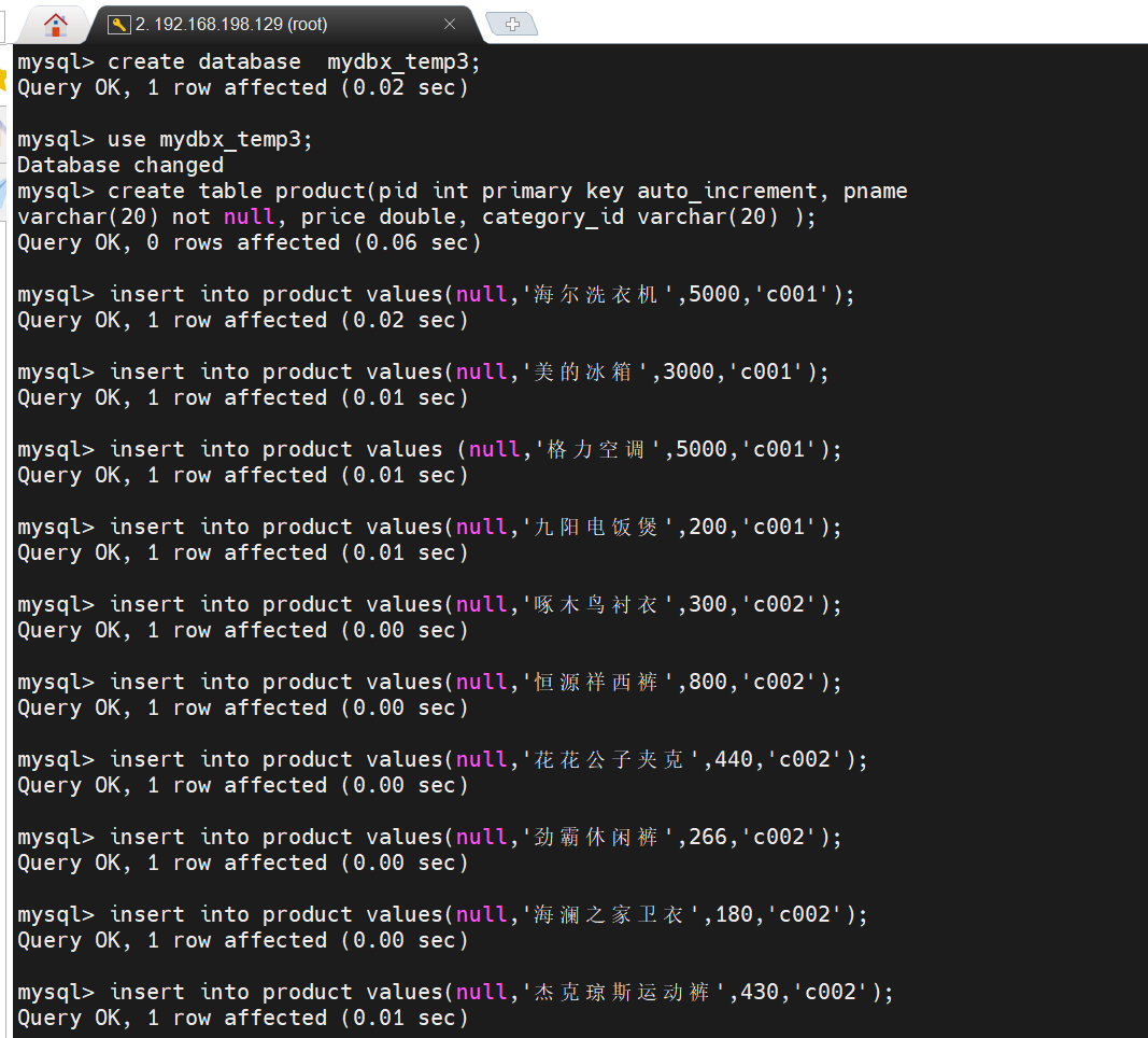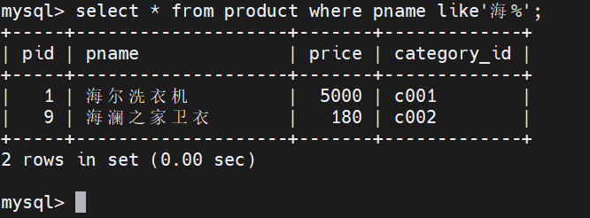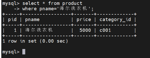 insert into product values(null,'海尔洗衣机',5000,'c001');