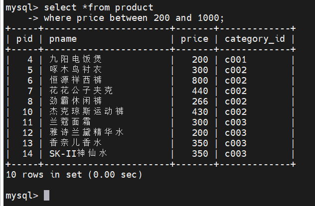 insert into product values(null,'雅诗兰黛精华水',200,'c003');