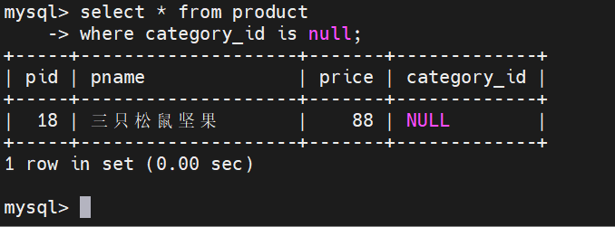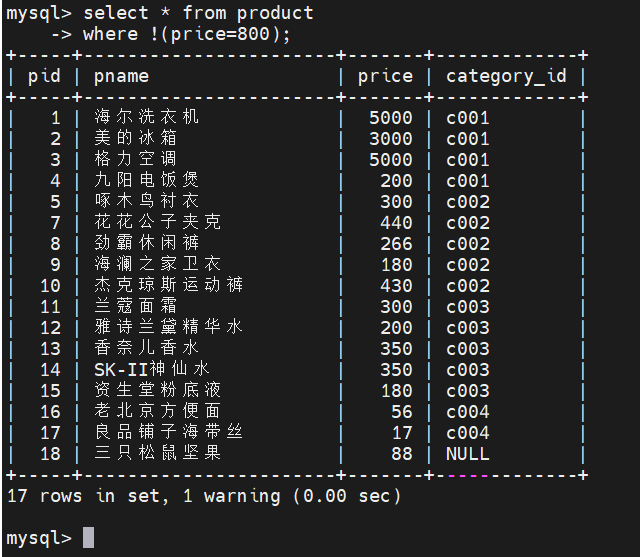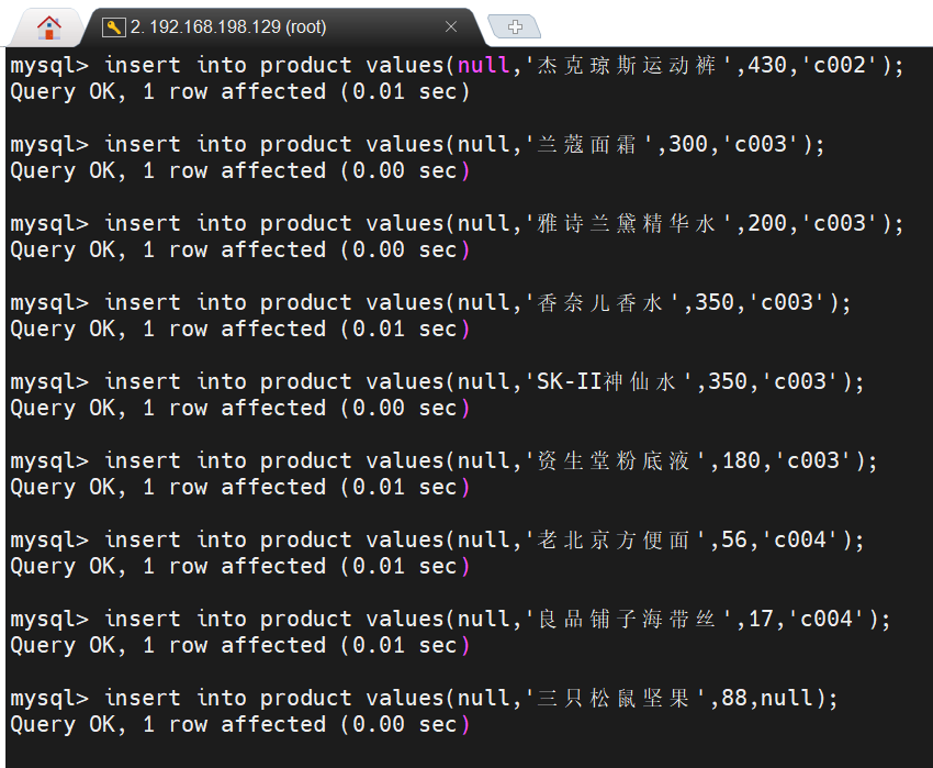 insert into product values(null,'良品铺子海带丝',17,'c004');