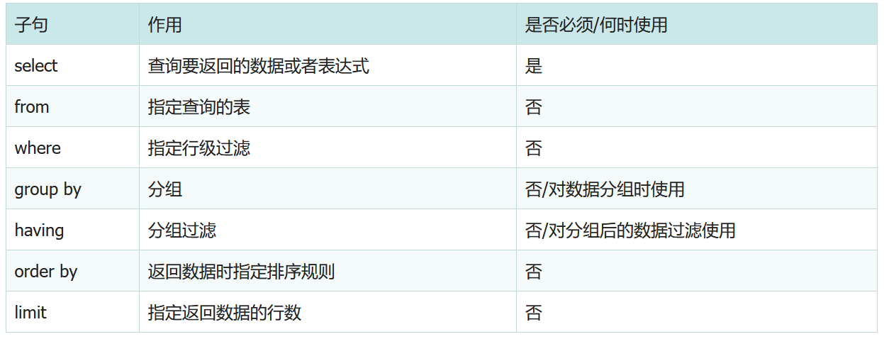 select 字段列表 from 表名列表 where 条件列表 group by 分组字段列表 having 分组后条件列表 order by 排序字段列表 limit 分页参数