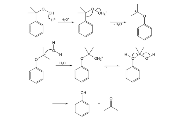 该法以丙烯和苯为起始原料,首先苯和丙烯在三氯化铝的作用下,产生异丙苯,异丙苯三级碳原子上的氢比较活泼,在空气的直接作用下,氧化生成过氧化物,过氧化物在酸的作用下,失去一分子水,形成一个氧正离子,苯环带着一对电子转移到氧上,发生所谓的缺少电子的氧所引起的重排反应,得到"碳正"离子,"碳正"离子再和水结合,去质子分解成丙酮及苯酚。由异丙苯经氧化、重排直至生成丙酮及苯酚的过程称为异丙苯的氧化重排。