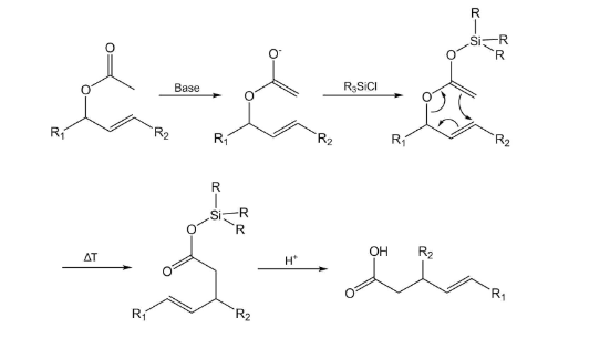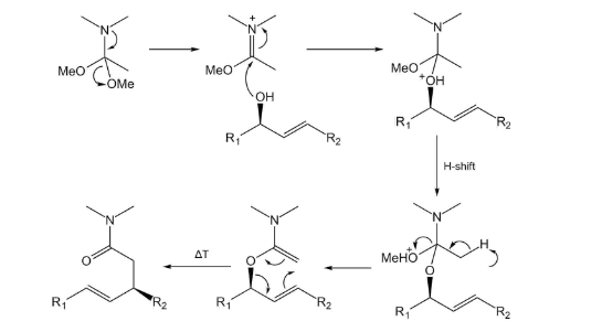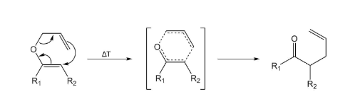 该反应是一类重要的有机周环反应,为协同反应机理([3,3]-σ 迁移),先形成六元环过渡态,然后氧原子上的烯丙基通过环状过渡态迁移至苯环(芳香族)或另一双键碳(脂肪族)。键的断裂与形成同步进行,无中间体生成。