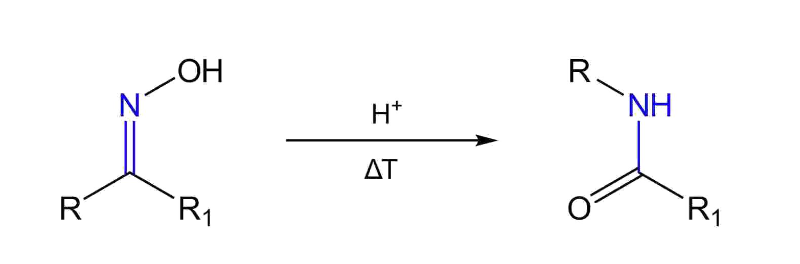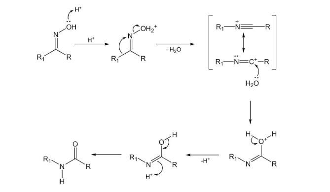 在酸作用下,肟首先发生质子化,然后脱去一分子水,同时与羟基处于反位的基团迁移到缺电子的氮原子上,烷基的迁移并推走羟基形成氰基,然后该中间体被水解得到酰胺。在酮肟分子中发生迁移的烃基与离去基团(羟基)互为反位。在迁移过程中迁移碳原子的构型保持不变。