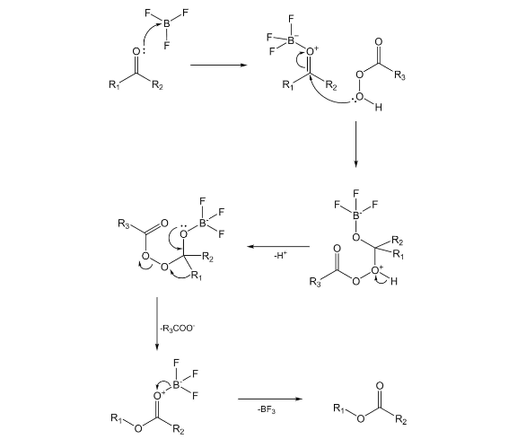 酮类化合物被过酸氧化,与羰基直接相连的碳链断裂,插入一个氧形成酯的反应称为拜耳-魏立格(Baeyer-Villiger)氧化重排。