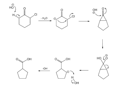 第一步,碱使α-卤代酮生成烯醇负离子,负离子进攻溴连接的碳原子,溴离子离去,形成环丙酮中间体;第二步,碱对环丙酮的羰基碳进行亲核加成,形成四面体中间体并引发基团迁移(三元环开环),生成羧酸的β-碳负离子,最终质子化得到羧酸产物。