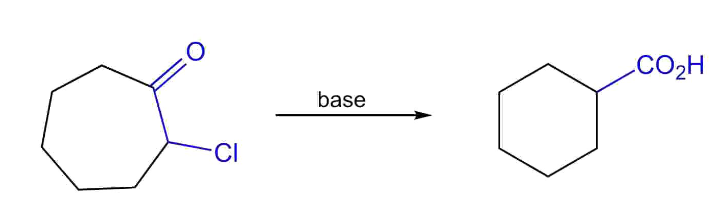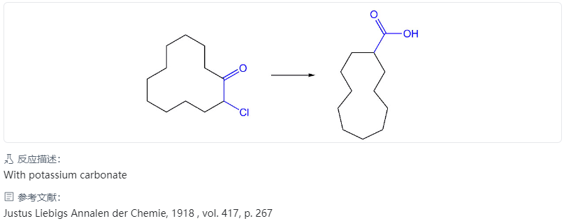 在醇钠或氢氧化钠或氨基钠等碱性催化剂存在下,α-卤代酮(氯代酮或溴代酮)失去卤原子,重排成具有相同碳原子的羧酸酯、羧酸、酰胺的反应。