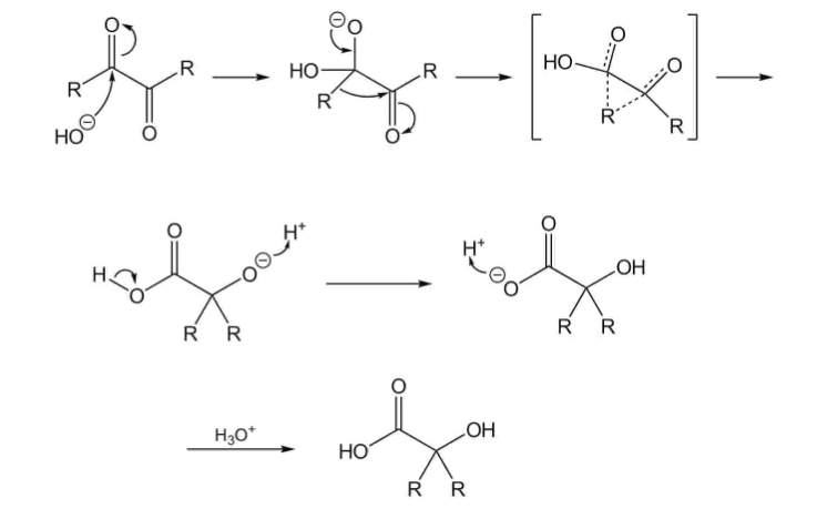 二苯乙醇酸重排是不可逆的过程。机理的第一步是在亲核试剂(HO-,醇盐或氨基离子)对C=O键的加成,得到四面体中间体。下一步是芳基或烷基迁移,形成相应的羟基盐,最后经酸处理,即可得到二苯乙醇酸。