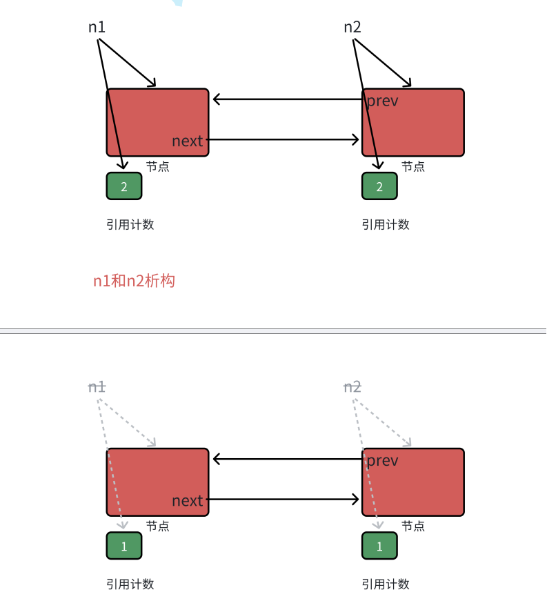 • 如下图所述场景,n1和n2析构后,管理两个节点的引⽤计数减到1