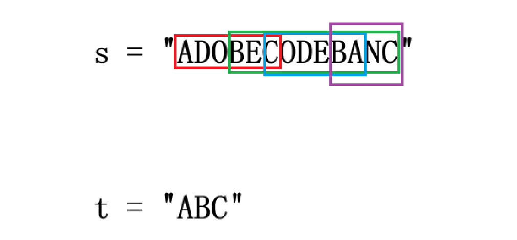 这道题目会给你一个 s 字符串与 t 字符串,该题目要求你返回 s 字符串中包含了 t 字符串中所有字符的最短子串(t 中如果存在两个相同字符,那也算是两个字符),其中这个子串包含的 t 字符串中字符的个数可以多于 t 字符串中的字符个数,但是不是少于 t 字符串中的字符个数。比如: