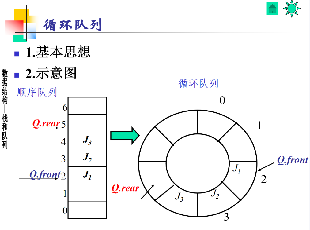 右边是循环队列 :把数组变成一个环,下标 0 接在 6 后面。队头 Q.front