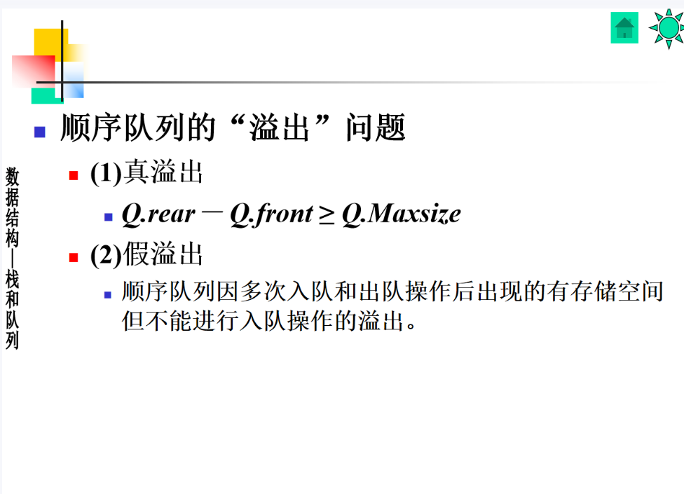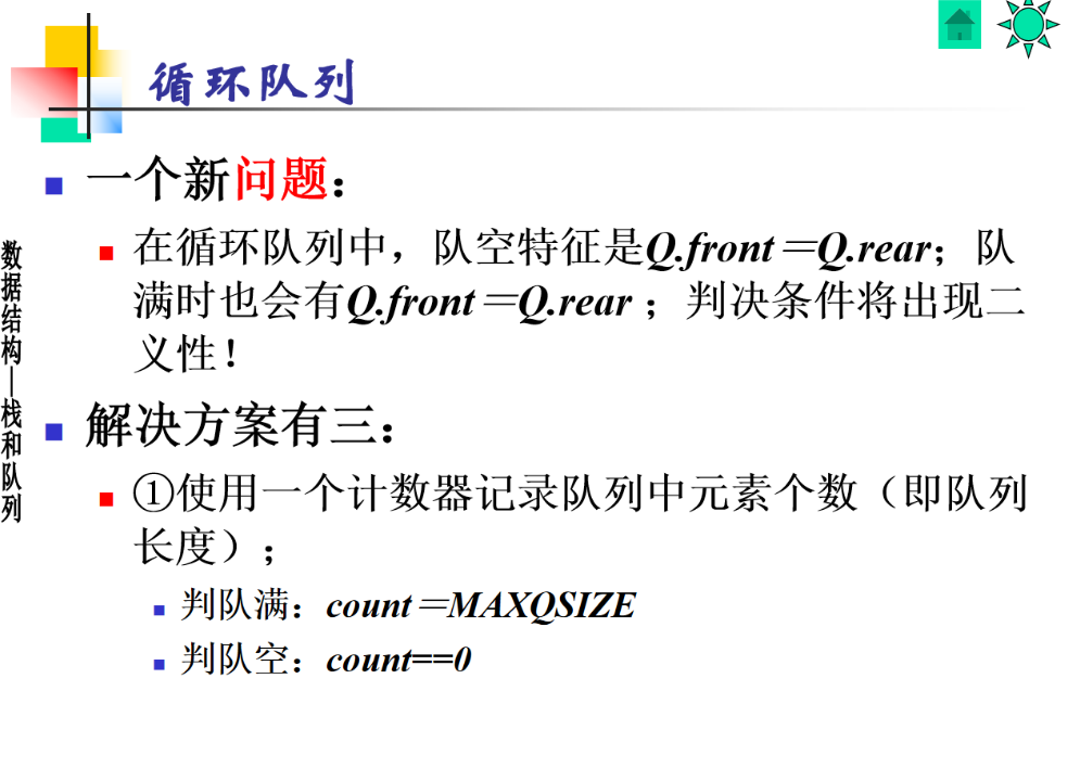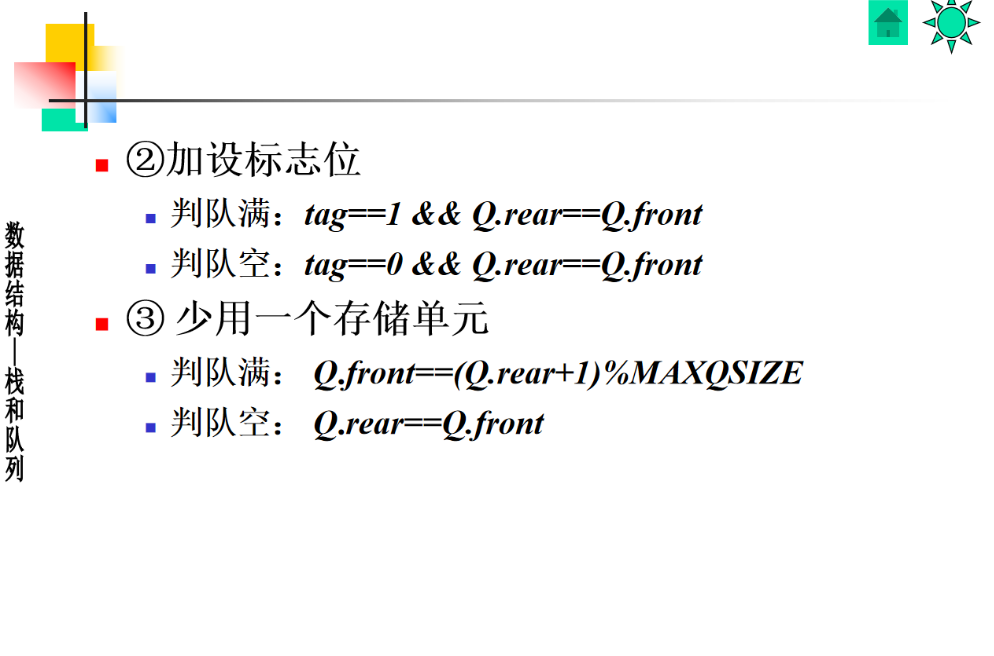 (MAXQSIZE 是数组最大容量,元素个数达到上限)。 - 解释:因为有