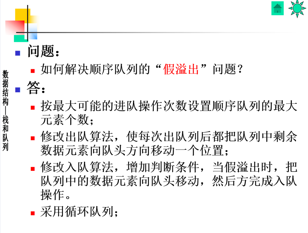 - 解释:当要入队时,先检查是不是假溢出。如果是,就把队列里已有的元素往队头方向挪,腾出队尾的位置,然后再把新元素入队。