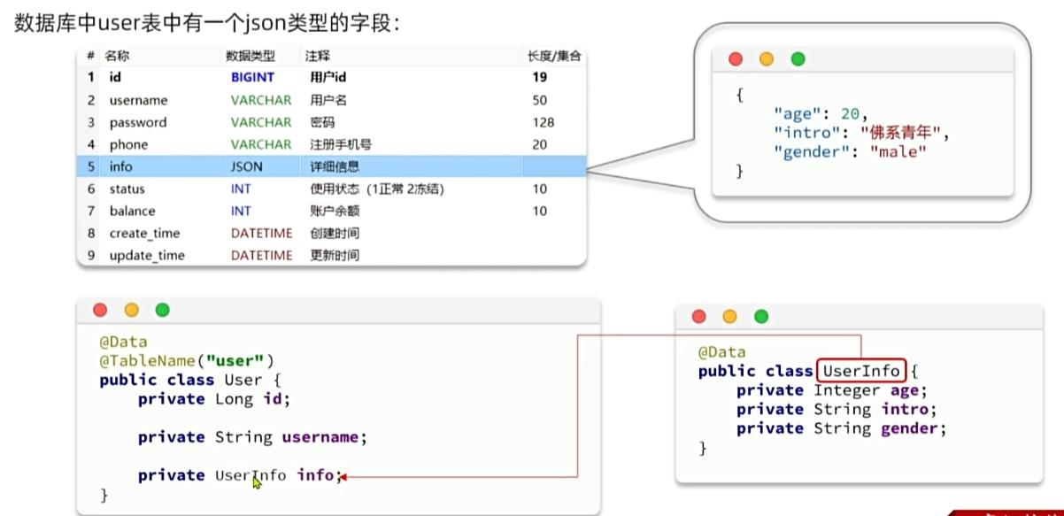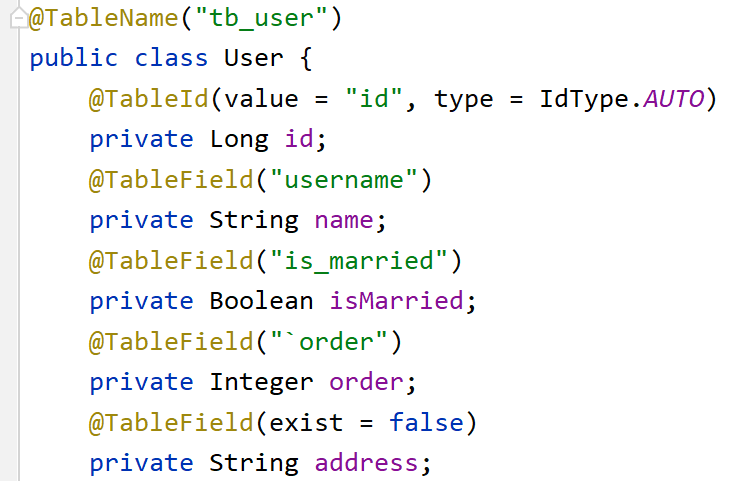 - @TableField:用来指定表中的普通字段信息