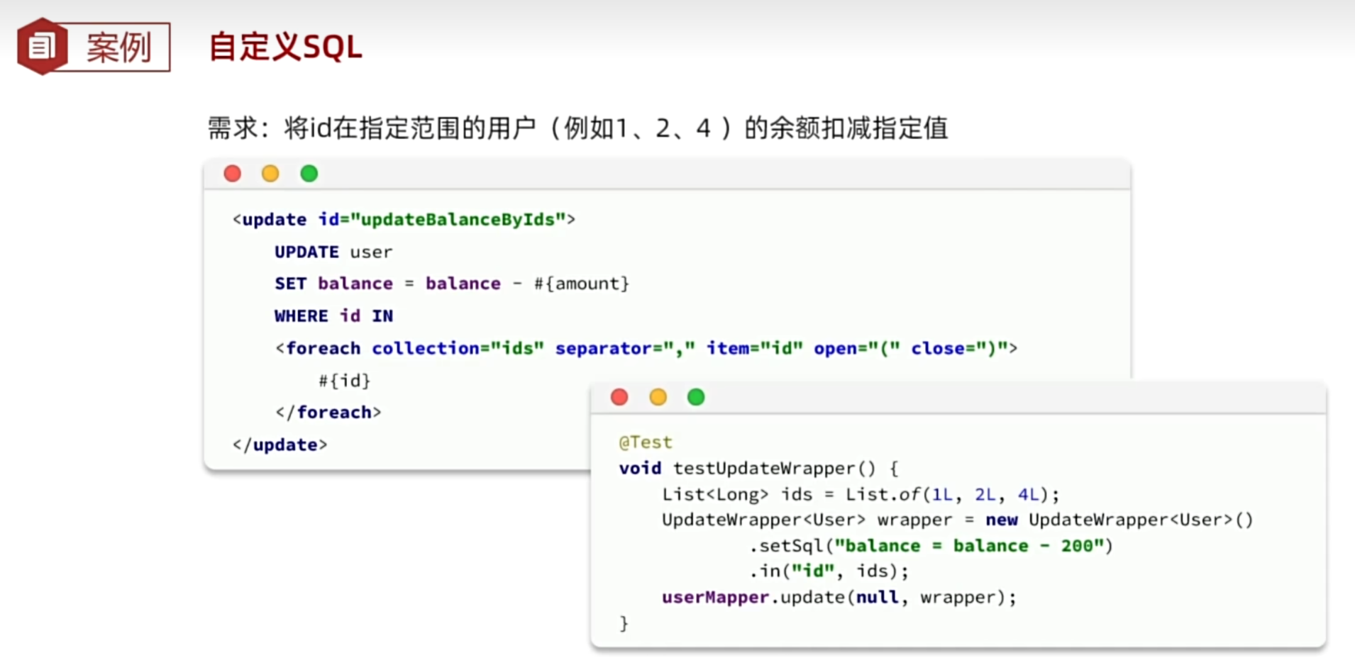 //update user set balance=balance-200 where id in (?,?,?)