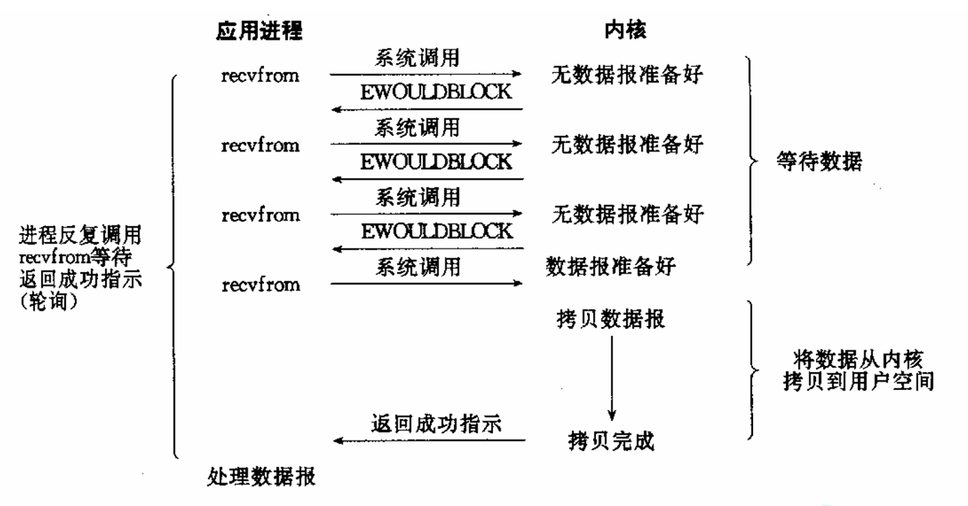 非阻塞IO:如果内核还未将数据准备好,系统调用仍然会直接返回,并且返回EWOULDBLOCK错误码。