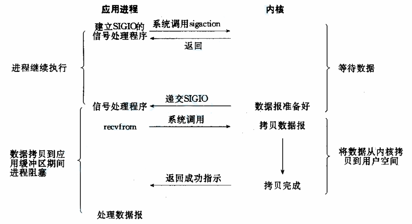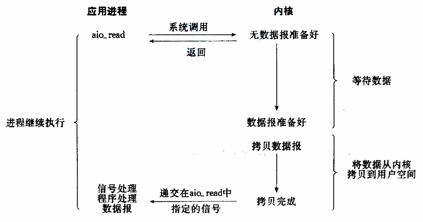 信号驱动IO:内核将数据准备好的时候,使用SIGIO信号通知应用程序进行IO操作。