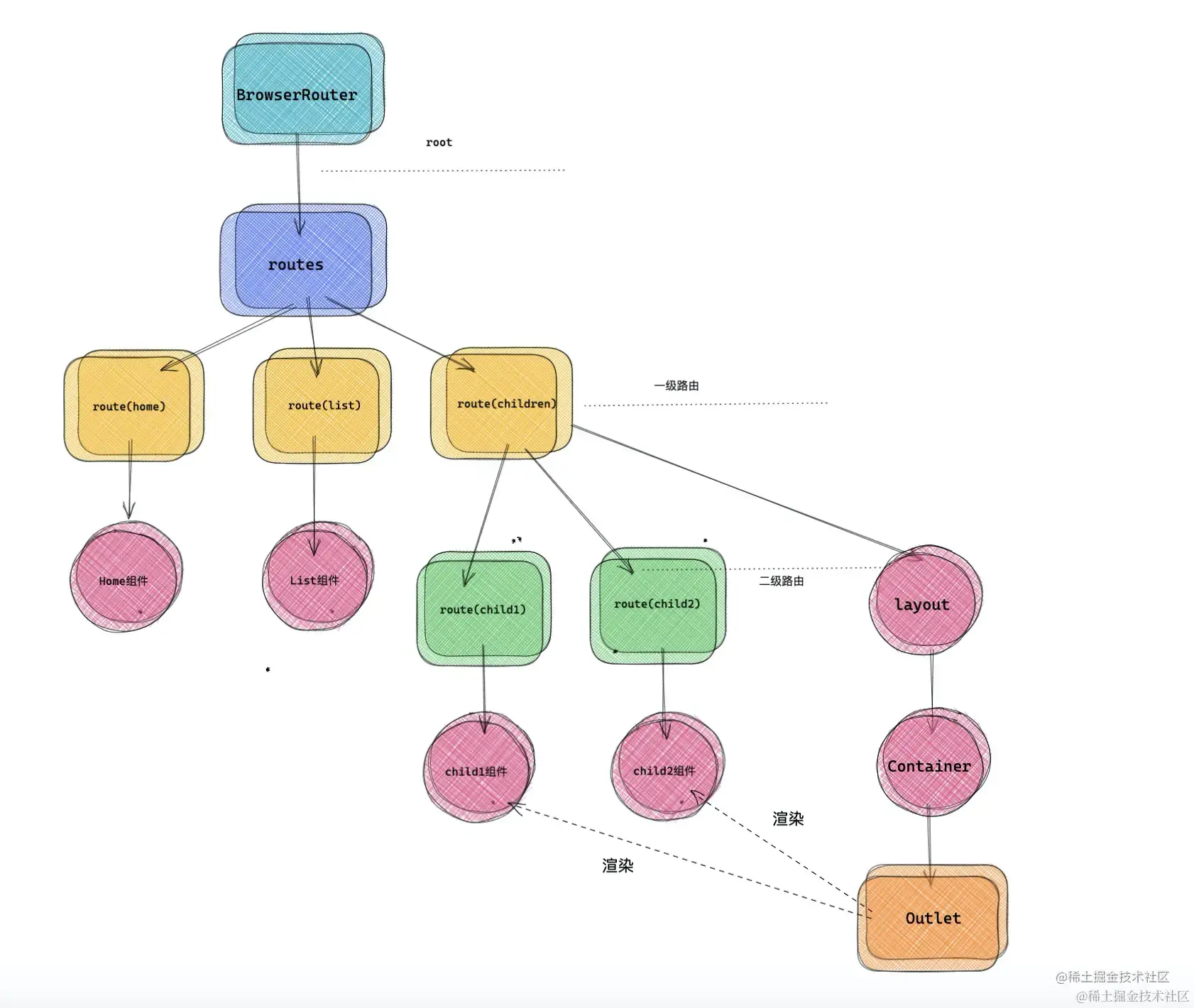 来拼接路径正则以实现不同模式的匹配(生成match对象),路由组件 作为一个高阶组件包裹业务组件, 通过比较当前路由信息match对象和传入的path,以不同的优先级来渲染对应组件 - 组件的渲染逻辑,子组件> component属性传入的组件 > children是函数 这样的优先级渲染