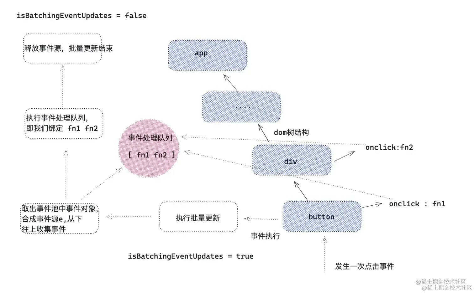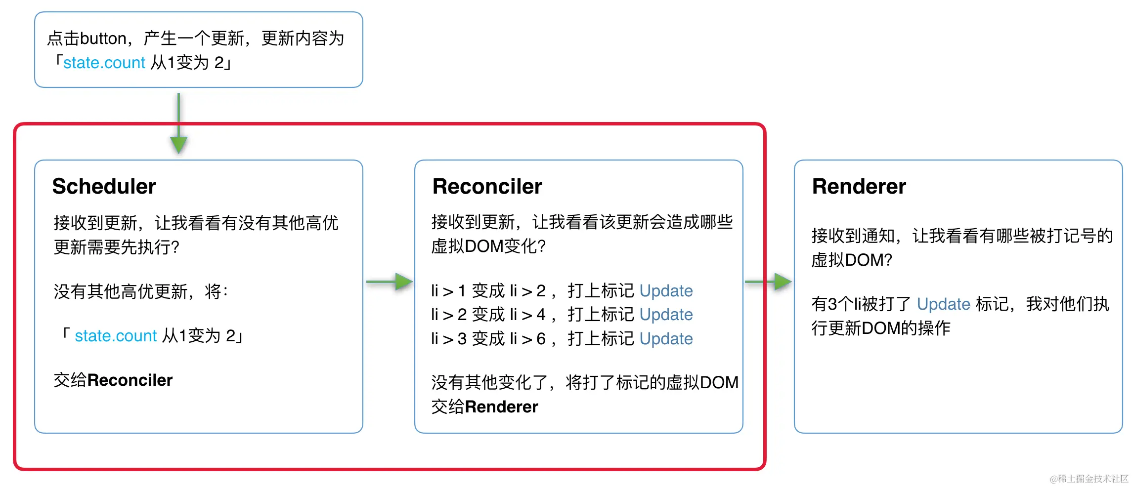 - Renderer 根据Reconciler为虚拟DOM打的标记,同步执行对应的DOM操作。