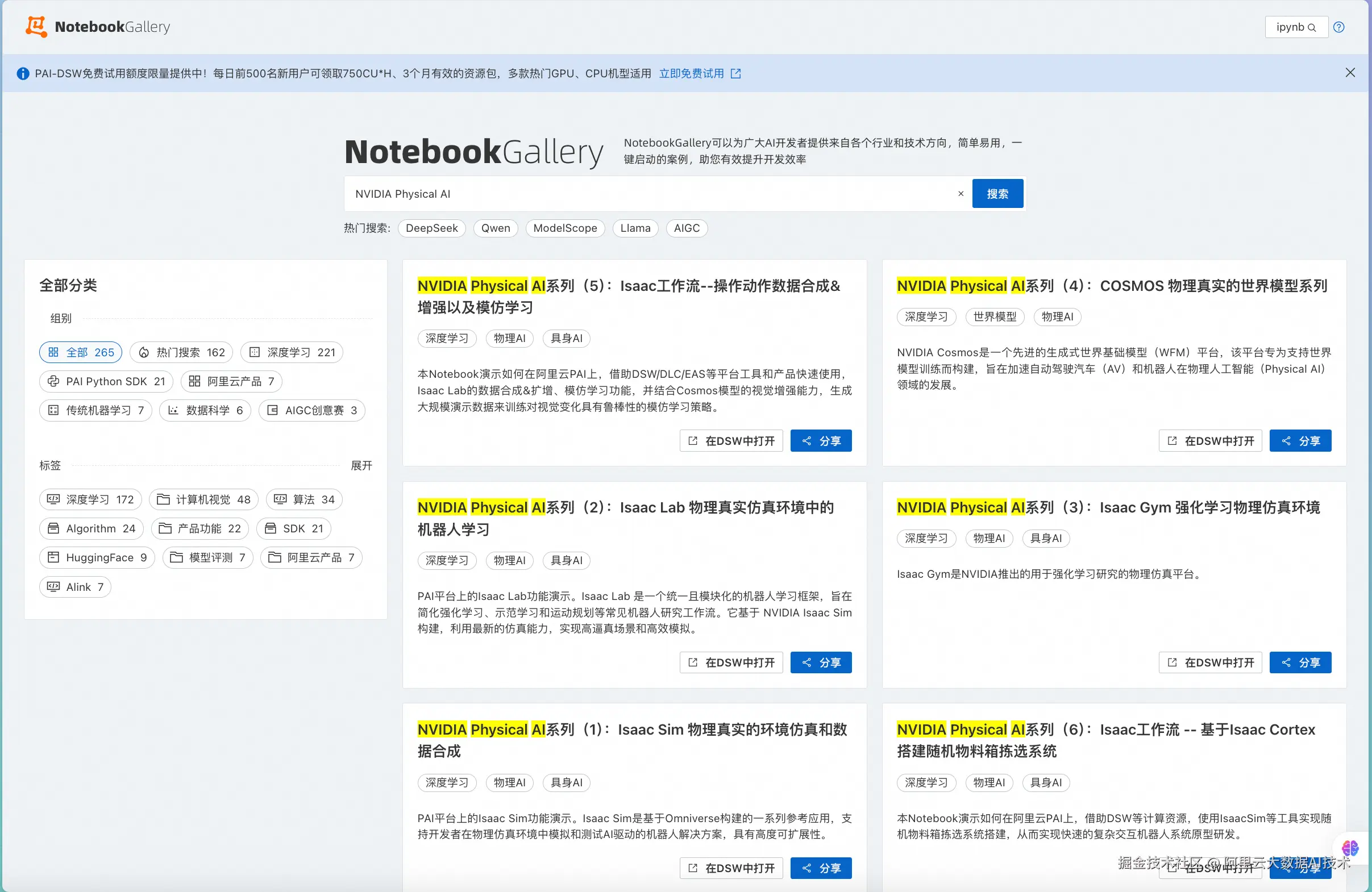 智码实验室 PAI- Notebook Gallery ,提供 Physical AI 及其他各个行业和技术方向的 Notebook 案例,简单易用、一键启动,有效提升开发效率。上述 Physical AI 全链路核心步骤的最佳实践,均可在 PAI- Notebook Gallery 中快速使用。PAI- Notebook Gallery 地址: https://gallery.pai-ml.com/ 同时,PAI 提供异构数据管理、异构算力合池、异构框架调度、异构部署兼容等核心功能: