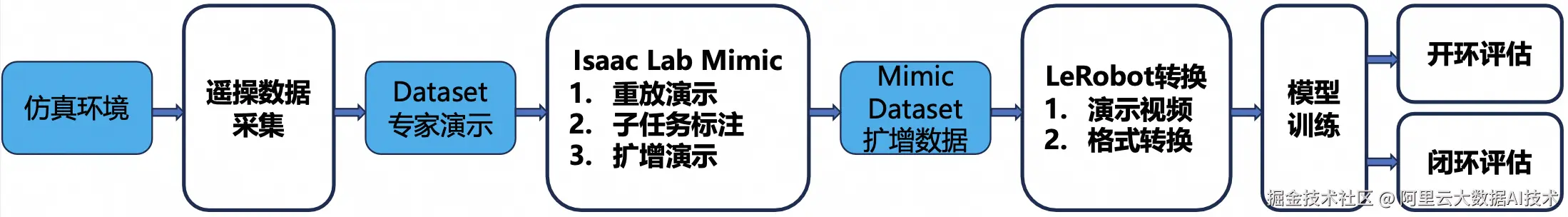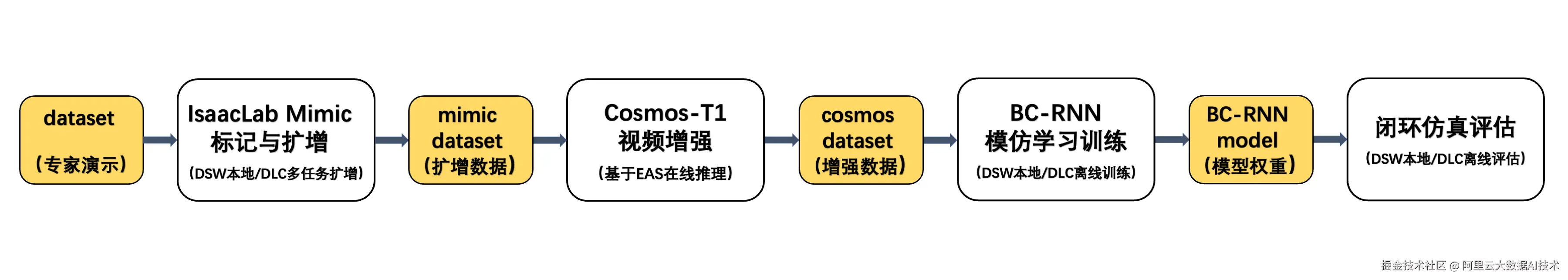 PAI 支持使用交互式建模 PAI-DSW、分布式训练PAI-DLC、模型推理服务PAI-EAS等平台工具和产品,结合 Isaac Lab的数据合成&扩增、模仿学习功能与Cosmos模型的视觉增强能力,生成大规模演示数据来训练对视觉变化具有鲁棒性的模仿学习策略。